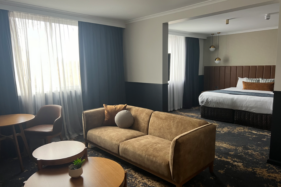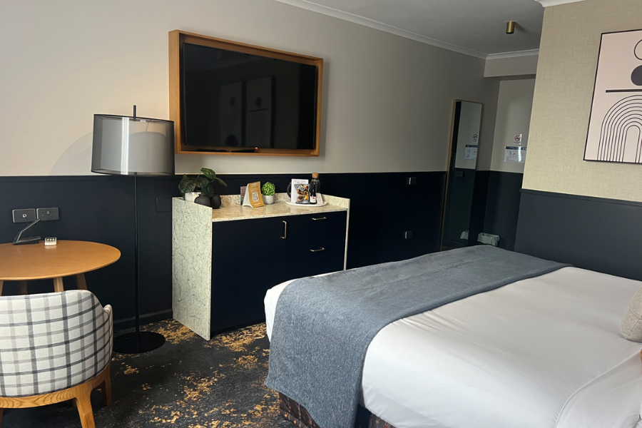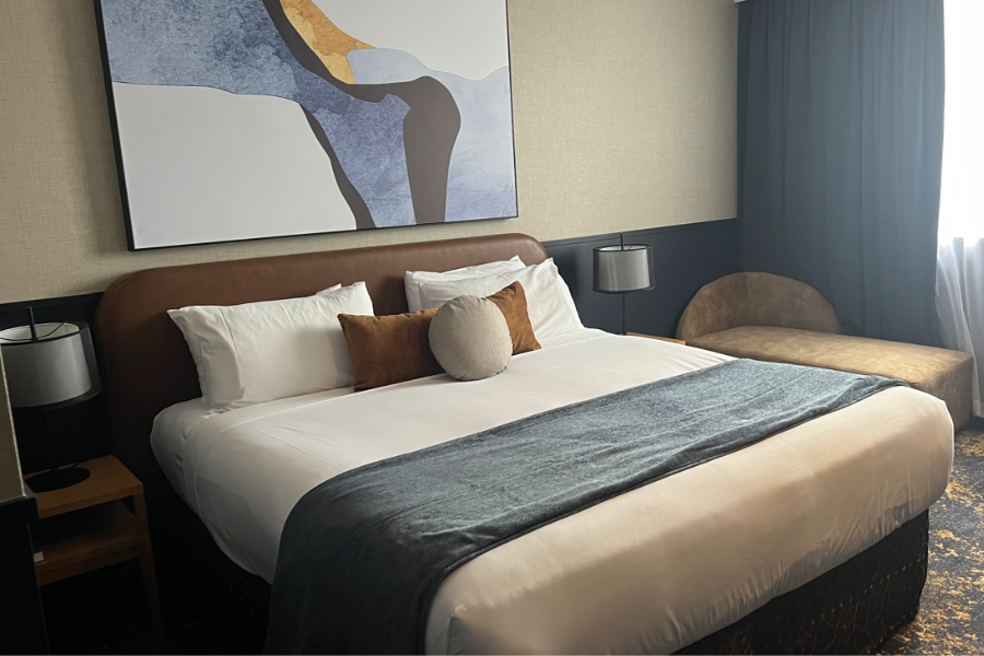 Newly renovated Executive King rooms with a spacious king bed promises a restful night’s sleep with its plush bedding. Comfortable armchair and corporate desk. Includes Flat Screen TV, Blackout Curtains, Mini Bar and Tea and Coffee making station.